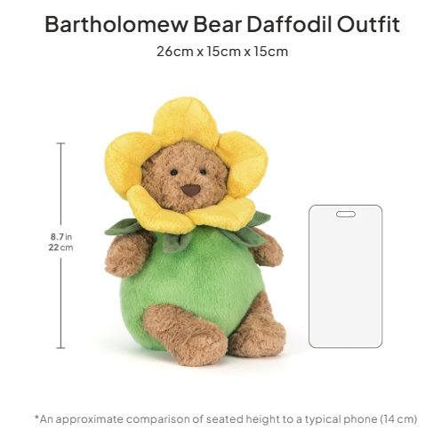 La tenue « Bartholomew Bear Daffodil » est en pleine floraison. Vêtu de la tête aux pieds de son costume ensoleillé aux couleurs des jonquilles, il canalise toute la puissance des fleurs et la partage généreusement avec tous ceux qu'il rencontre, en offrant naturellement un spectacle printanier à ses amis !