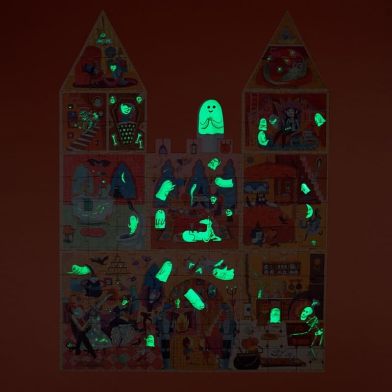 Un puzzle réversible de 100 pièces phosphorescentes représentant des monstres et des fantômes.