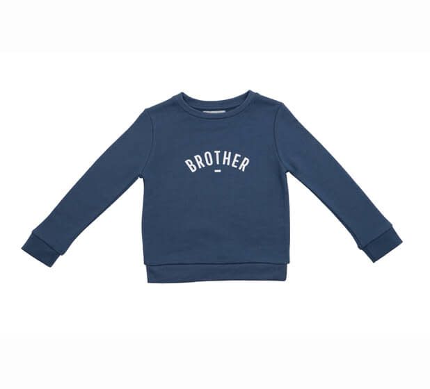 Donkerblauwe sweater met wit opschrift 'Brother '. Eveneens beschikbaar in staalblauw of zachtgroen (fern) met wit opschrift 'Brother'. Mix en match met de onesie 'brother' of sweater 'sister'.