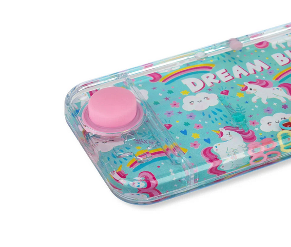 Het lijkt op een console, maar het heeft geen batterij nodig. Het werkt op water en past in je zak. Weet je al wat het is? Het is Legami's Unicorn-thema Mini Water Game! Druk op de knoppen om de ringen te verplaatsen en richt op de palen. En maak je geen zorgen als je ze niet allemaal in één keer vasthaakt. Het waterspel is zo klein dat je het overal mee naartoe kunt nemen en kunt oefenen totdat je kampioen bent geworden.